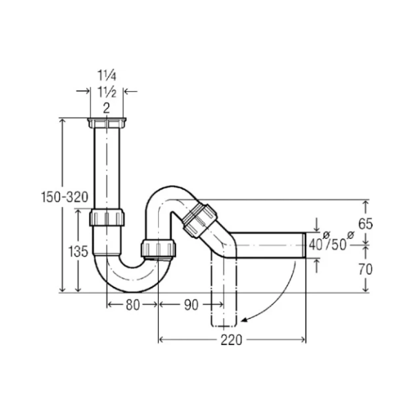 De sifon heeft een standaard 5/4"-aansluiting (circa 40 mm), wat compatibel is met de meeste wastafelpluggen en afvoerbuizen. Met zijn geïntegreerde waterslot zorgt hij voor een betrouwbare geurafsluiting, zodat je badkamer fris blijft.